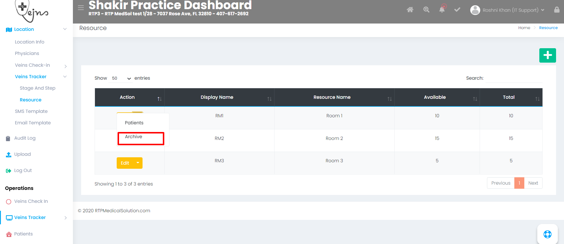 1. Navigate to Admin. 2. Navigate to Location, select Veins Tracker and from the dropdown select Resource. 3. Click on the "+" icon located on the top right of the table. - Enter all applicable information. - Click the "Create" button at the bottom ...